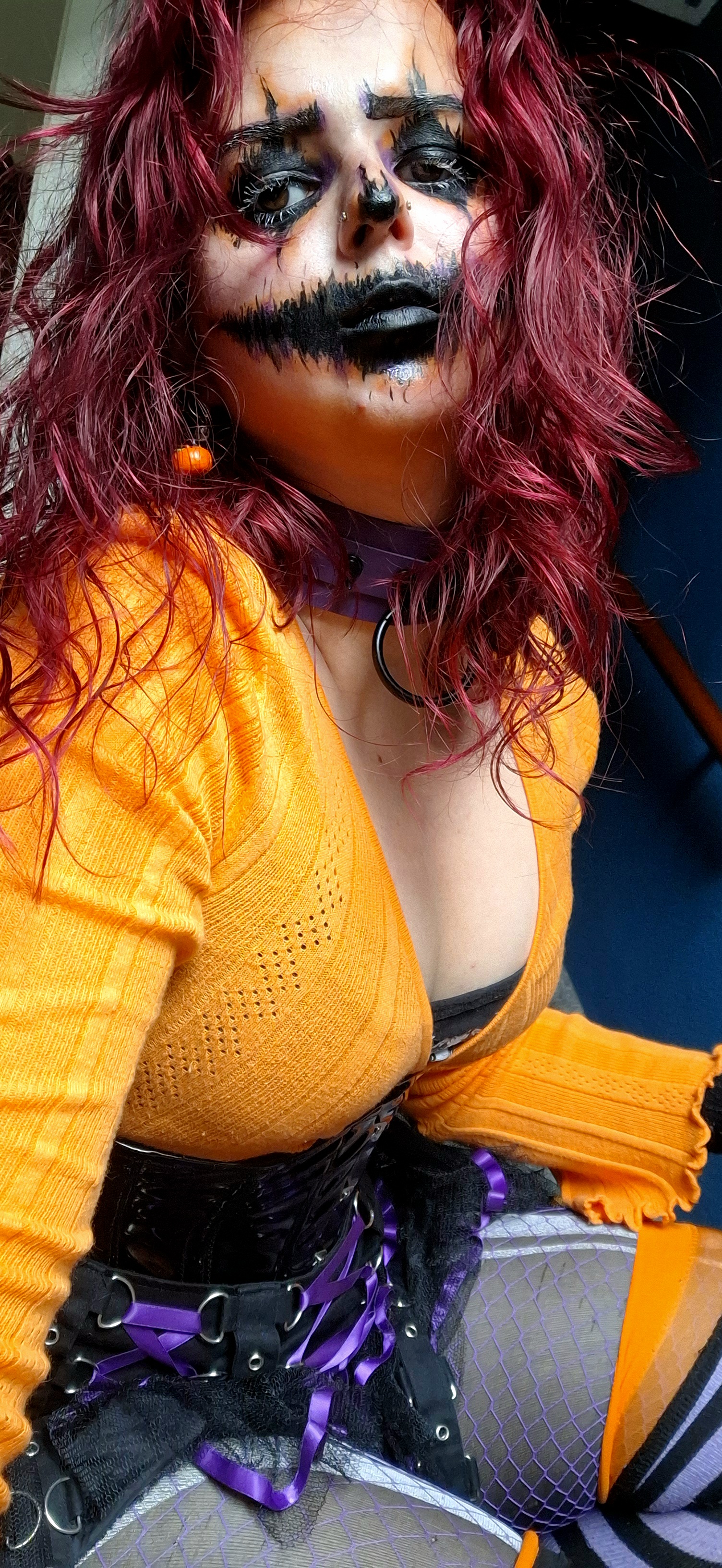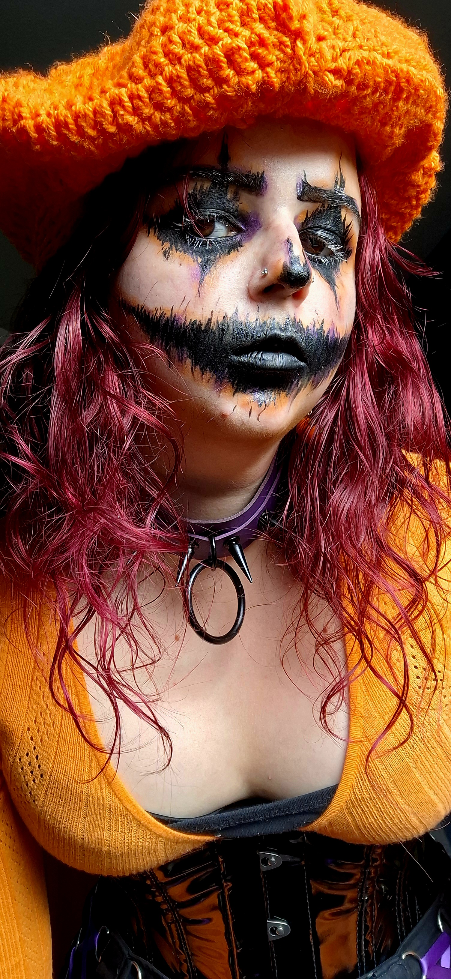 For this year's costume I decided to mix two Halloween classics; the jack-o'-lantern and a creepy clown. I also choose purple and orange because those colours combined basically scream Halloween for me. For the makeup I tried to go for a more creepy jack-o'-lantern vibe mixed with some whimsy and the colours from the clown aesthetic.